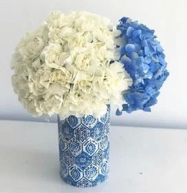 40 claveles blanco y Hortensia azul.