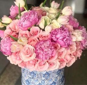 75 Rosas caricia. 1 decena de tulipanes rosas y 1 decena de peonias fucsia.
