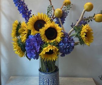 Girasoles, delfiniums, hortensias y limon eureka.