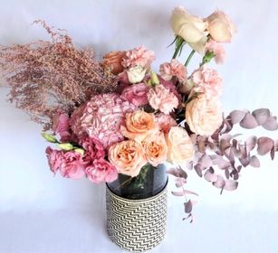 Follajes secos en tonos rosas. Rosa inglesa, rosas y lisianthus.
