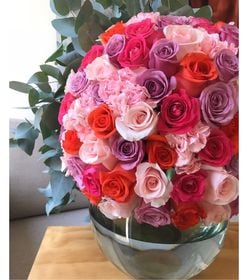 Mezcla de rosas naranjas, cool water, caricia y fucsia con eucalipto.