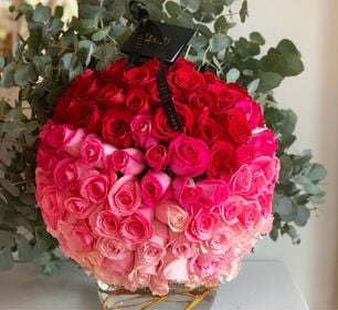 Rosas caricia, fashion, fucsia y rojas acomodadas de claro a fuerte y eucalipto.