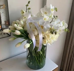 100 rosas Blancas, 2 decenas de tulipanes blancos y 4 varas de orquídeas blancas.