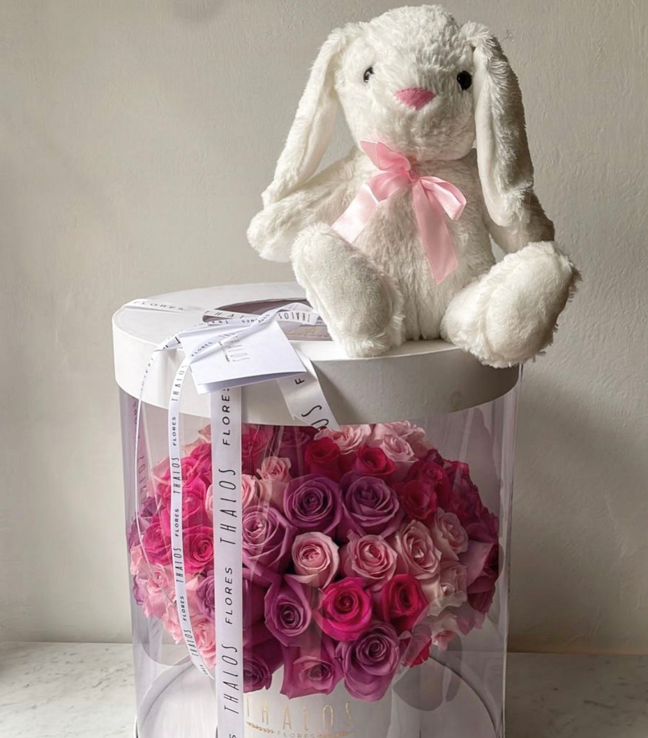 Conejo blanco con nombre bordado en rosa. Varios colores a elegir.